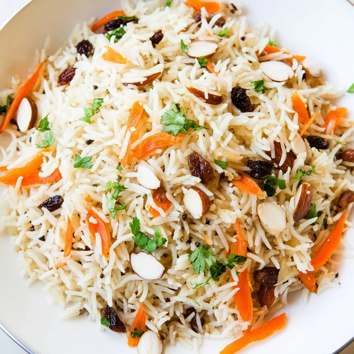 This aromatic Afghan rice transforms simple basmati into something extraordinary with warming spices like cardamom, cinnamon, and cloves. The grains are first toasted in fragrant oil, then simmered until perfectly tender. While the rice cooks, carrots become sweet and tender in the skillet, joined by plump raisins and toasted almonds. The finished dish combines fluffy spiced rice with jewel-like carrot ribbons and bursts of sweetness throughout.
