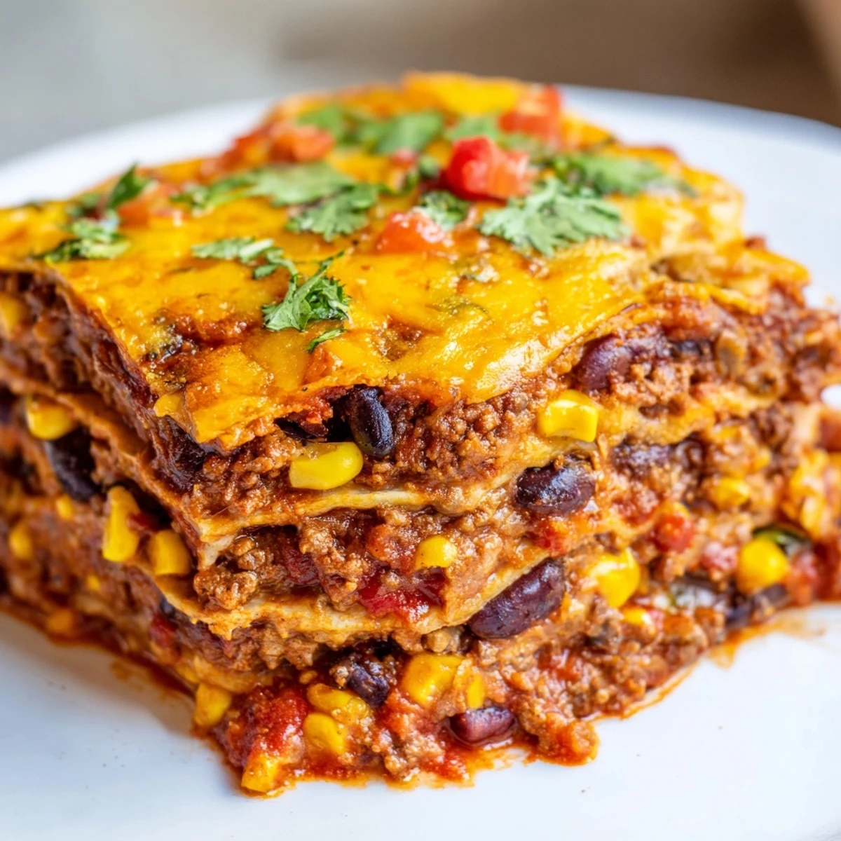 This comforting Tex-Mex casserole layers seasoned ground beef with corn, black beans, and aromatic spices between soft corn tortillas. Everything gets smothered in red enchilada sauce and a generous blend of cheddar and Monterey Jack cheeses. After baking until bubbly and golden, the layers meld together into a satisfying meal that's perfect for feeding a crowd.