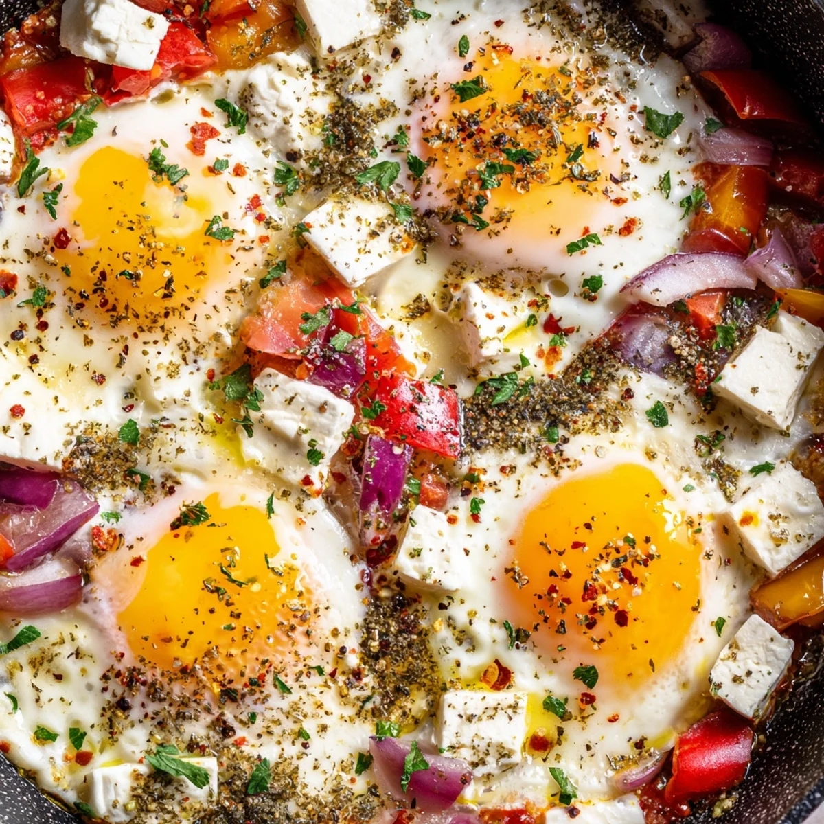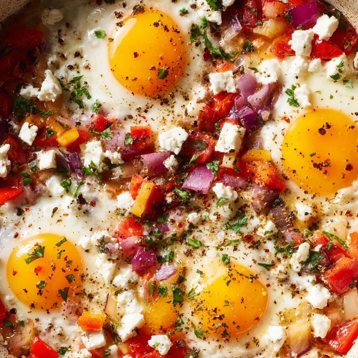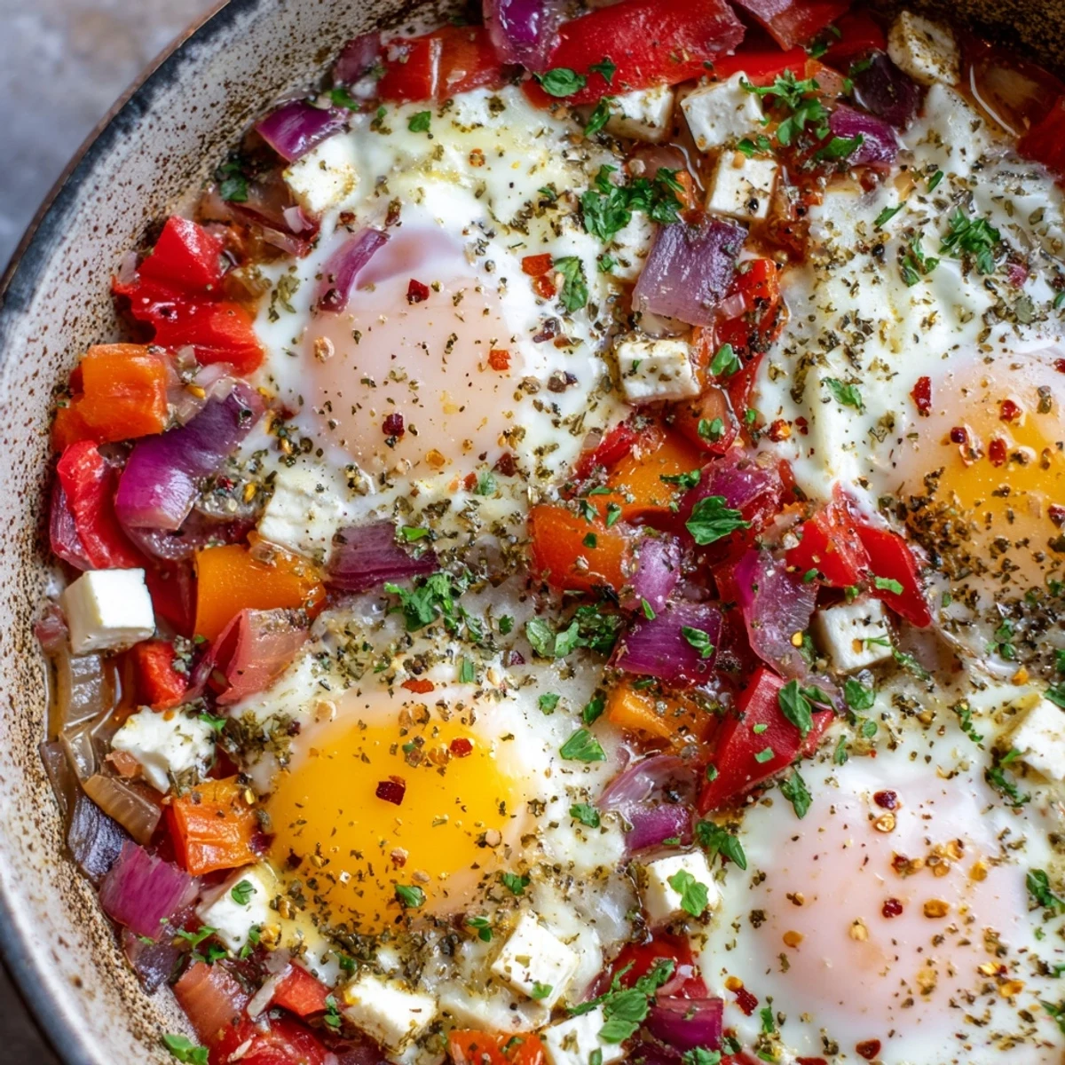 Transform your breakfast routine with this Mediterranean-inspired baked feta dish. Creamy feta cheese melts into a bed of sautéed tomatoes, bell peppers, and red onions, creating perfectly wells for four eggs to bake until set. Finished with aromatic oregano and fresh parsley, this protein-packed morning meal comes together in just 28 minutes.
