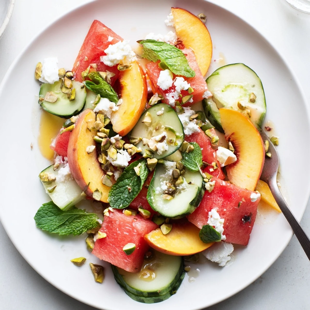 This summer fruit salad combines cubed watermelon, sliced ripe peaches, and thin cucumber for crunch. A simple honey-lime vinaigrette with olive oil brightens the fruit, while torn mint and basil add herbal lift. Optional feta and toasted pistachios bring salty and nutty contrast. Toss gently and serve immediately to preserve texture and freshness; avoid long refrigeration.